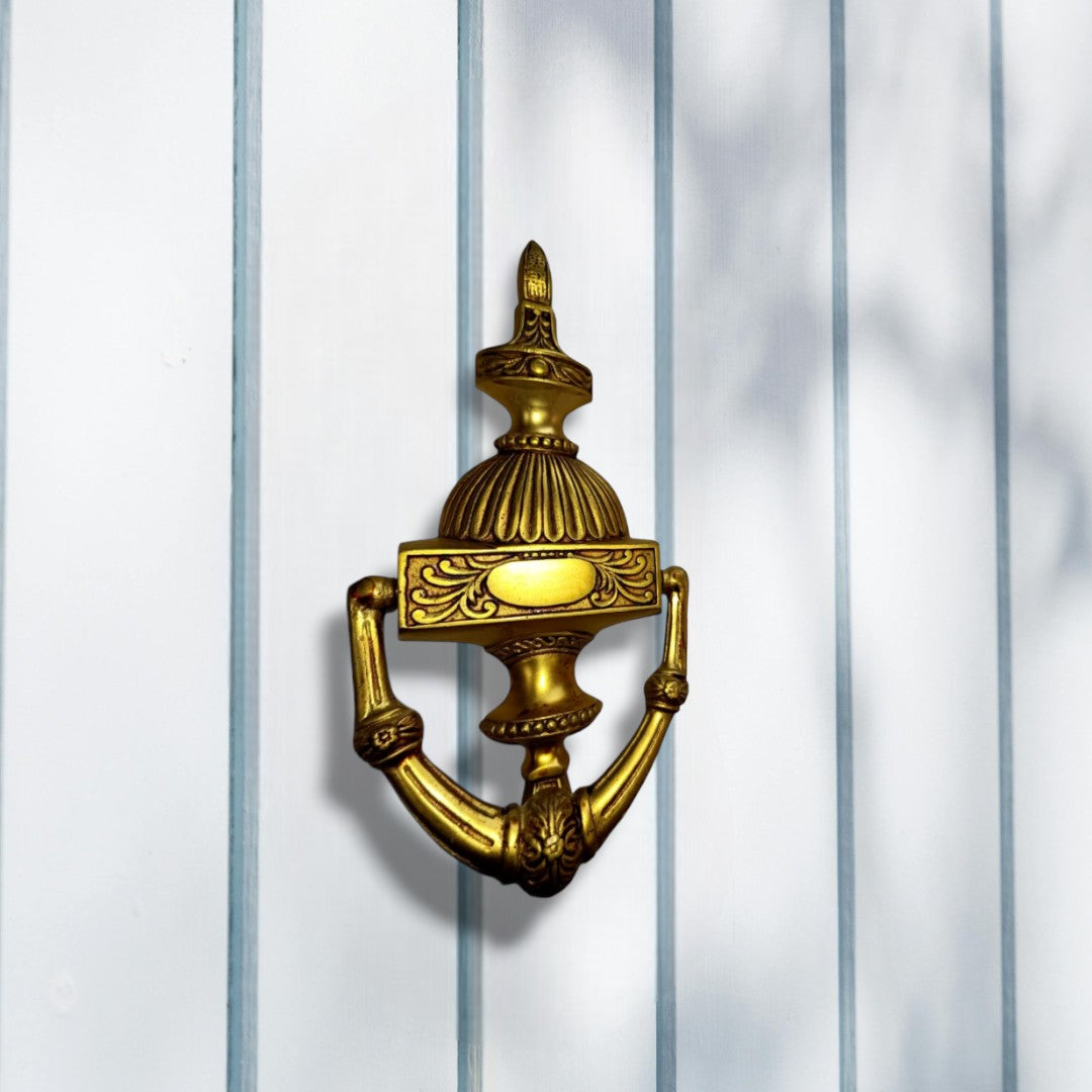 Enhance the grandeur of your entrance with the Antique Elegant Brass Door Knocker from EPOCH ELEMENTS, a distinguished addition to your collection of door accessories. This door knocker for the main door stands as a testament to timeless design and superior craftsmanship. Each piece is expertly forged from high-quality brass, ensuring both durability and a lasting shine that complements any architectural style, whether adorning a wooden door or a modern facade.