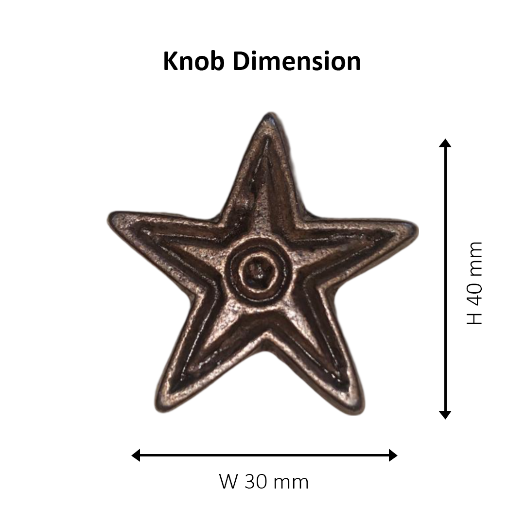 Style: Antique; Size: L-30, W-40, D-20; Finish : Hardware with enamel paint; Material : Iron; Colour : Brown; Suitable for: Doors, Cabinets etc. Elevate your main door with the Star Knob, a focal point that welcomes with both rustic charm and functionality. The design seamlessly integrates into various spaces, making it suitable for a variety of applications, from the bedroom to the bathroom and beyond.