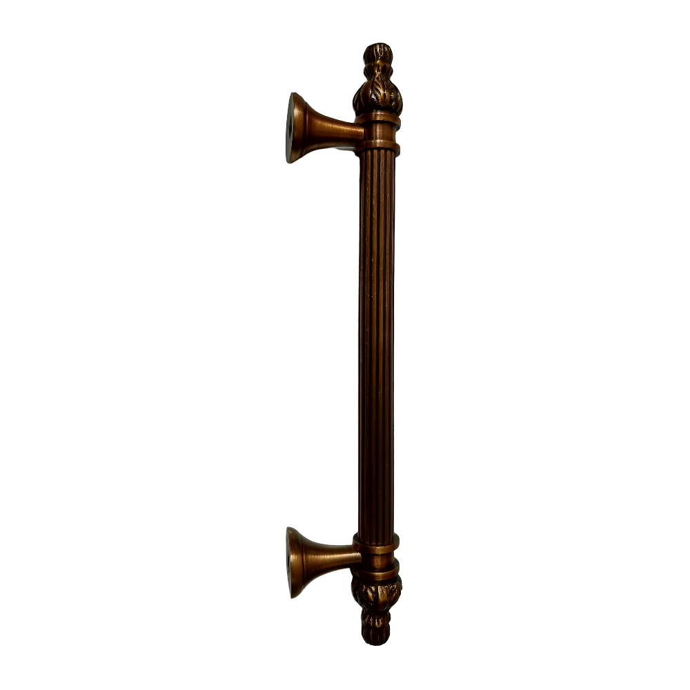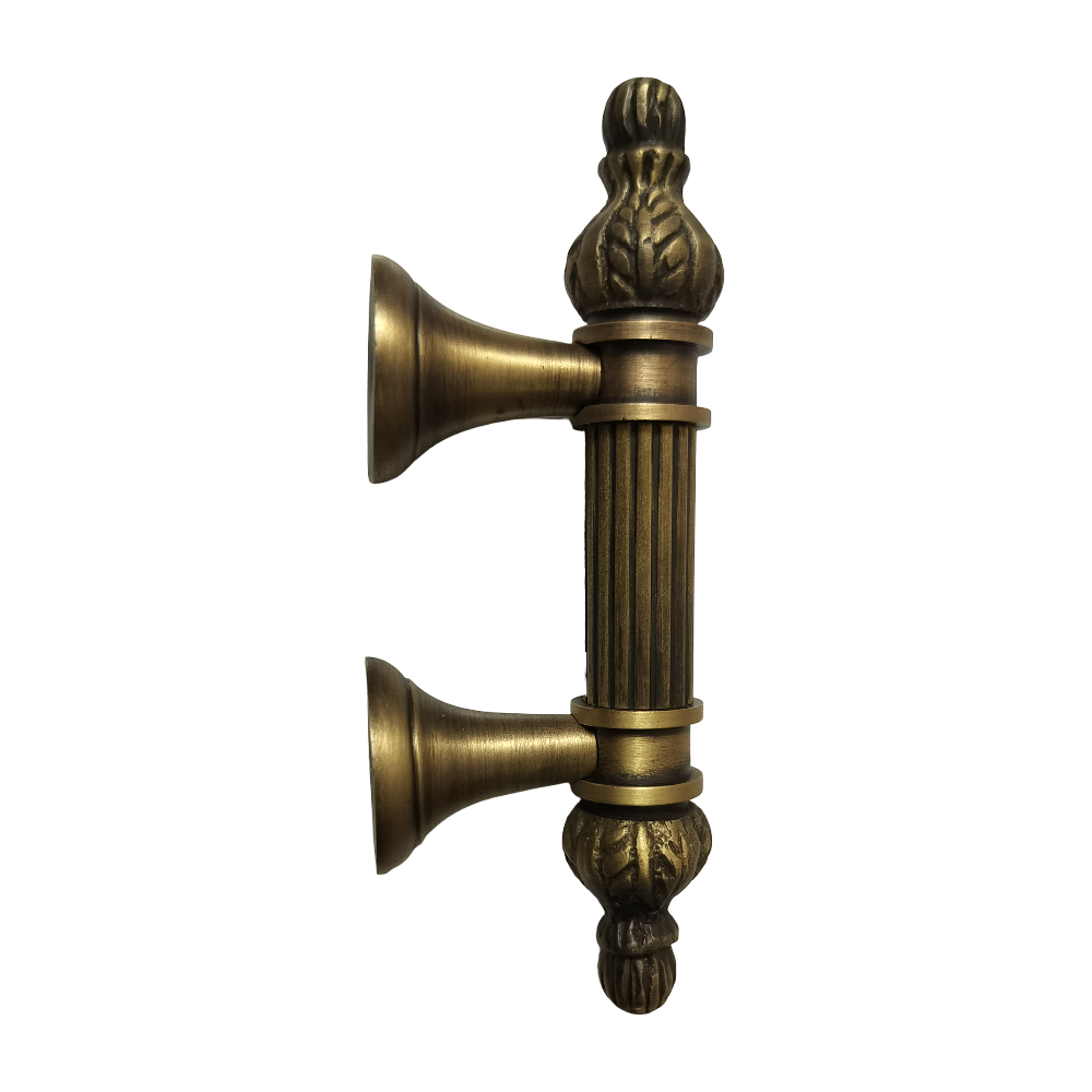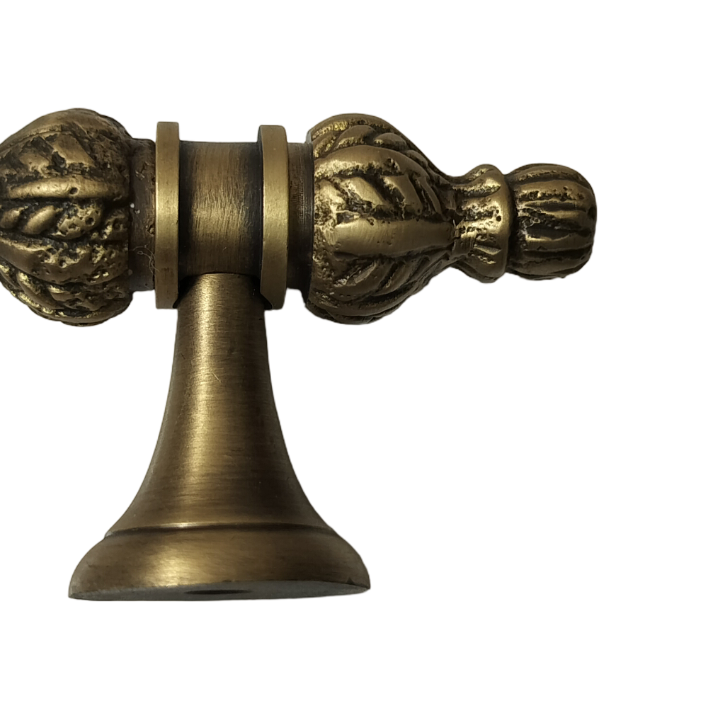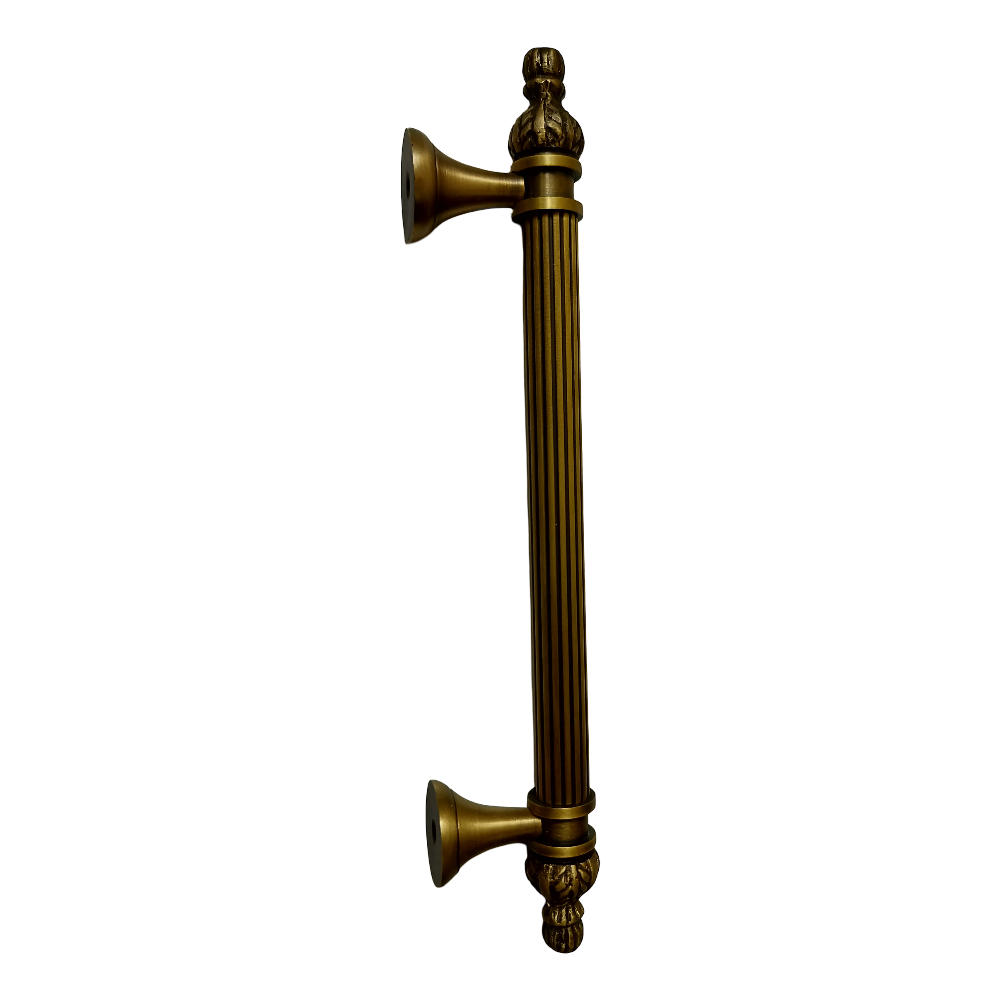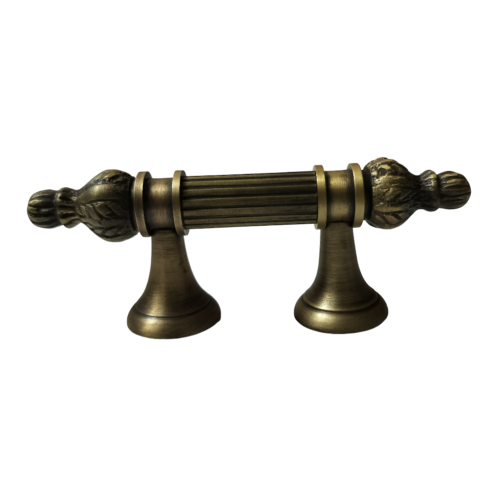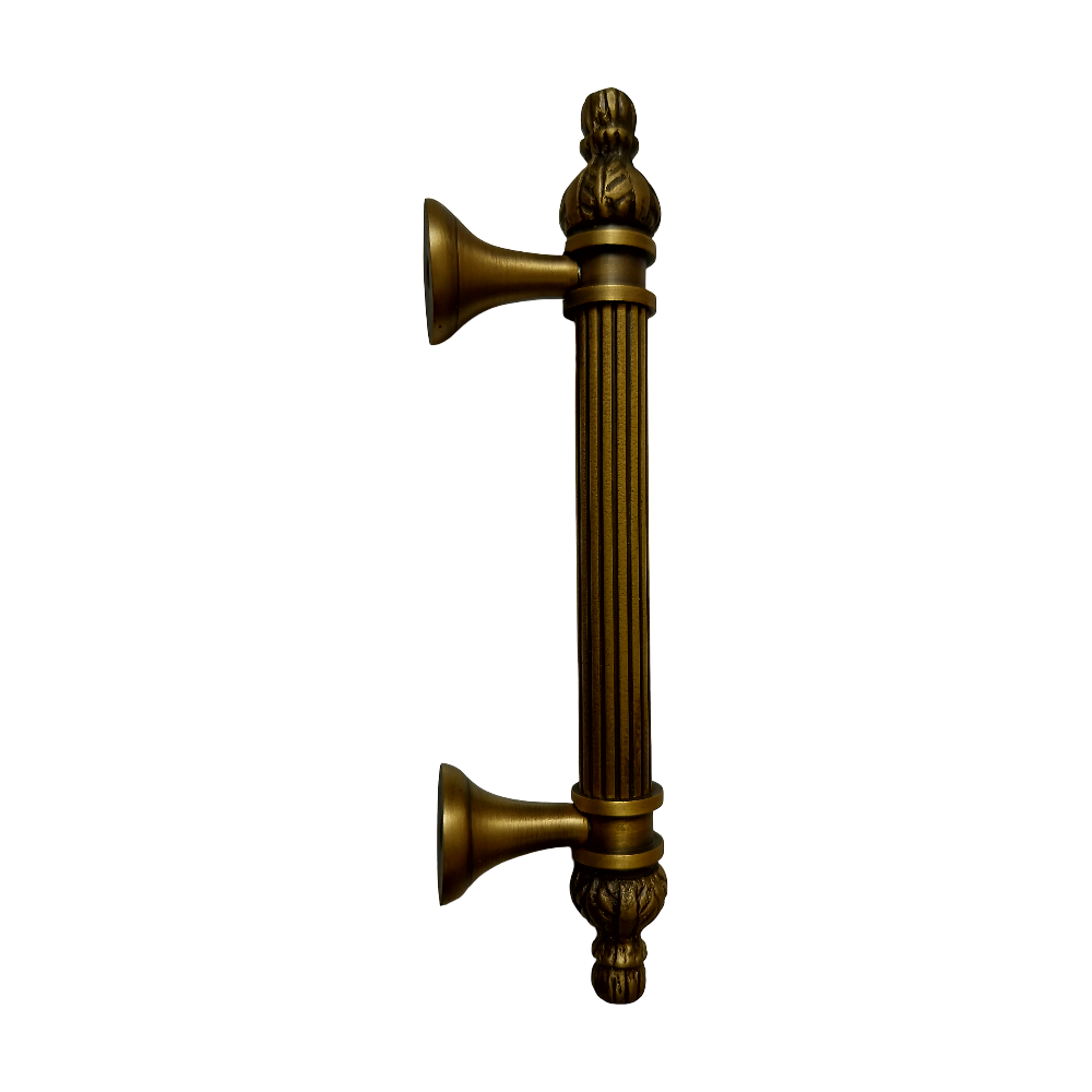 Designed for use on drawers, cabinets, wardrobes, and other wooden furniture, the handle combines classic aesthetics with modern durability. Its fluted central rod offers a secure grip, while the ornamental end caps with floral patterns add a regal touch. The robust brass construction ensures long-lasting performance, and the antique brass finish blends seamlessly with both heritage and contemporary interiors.