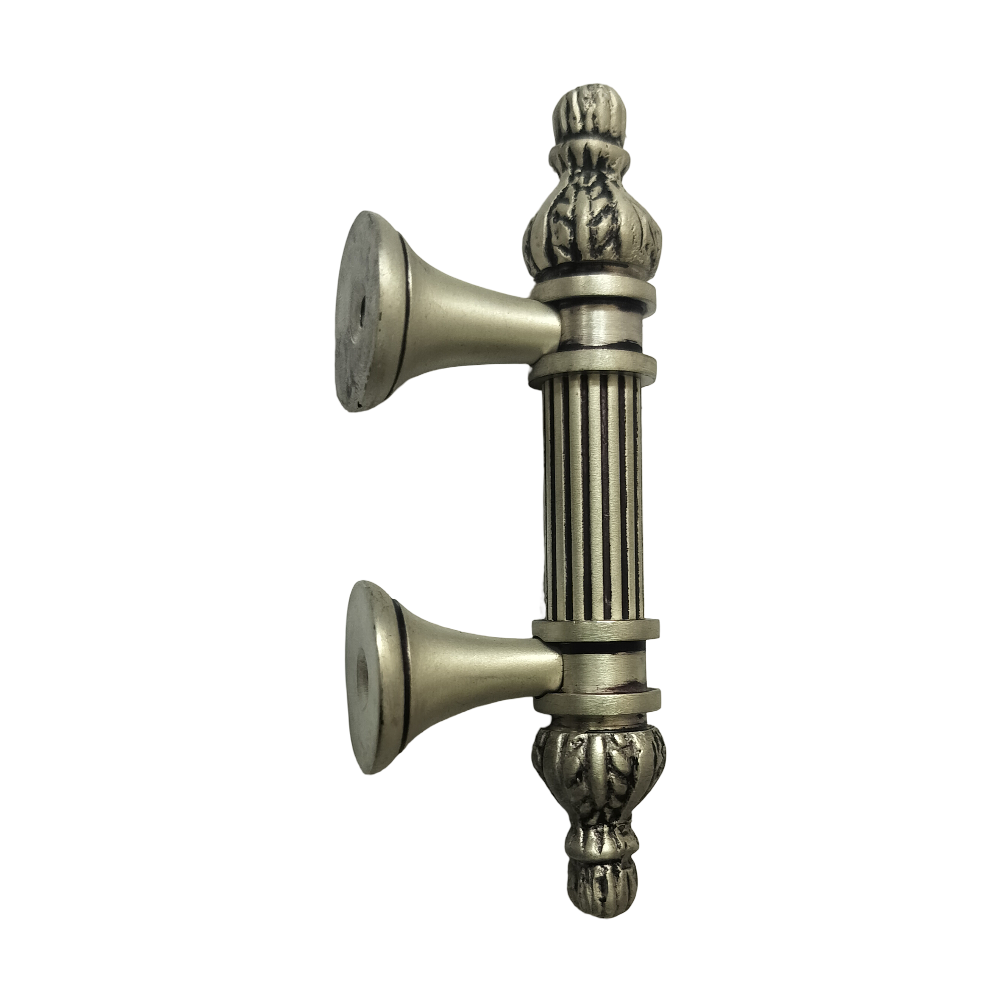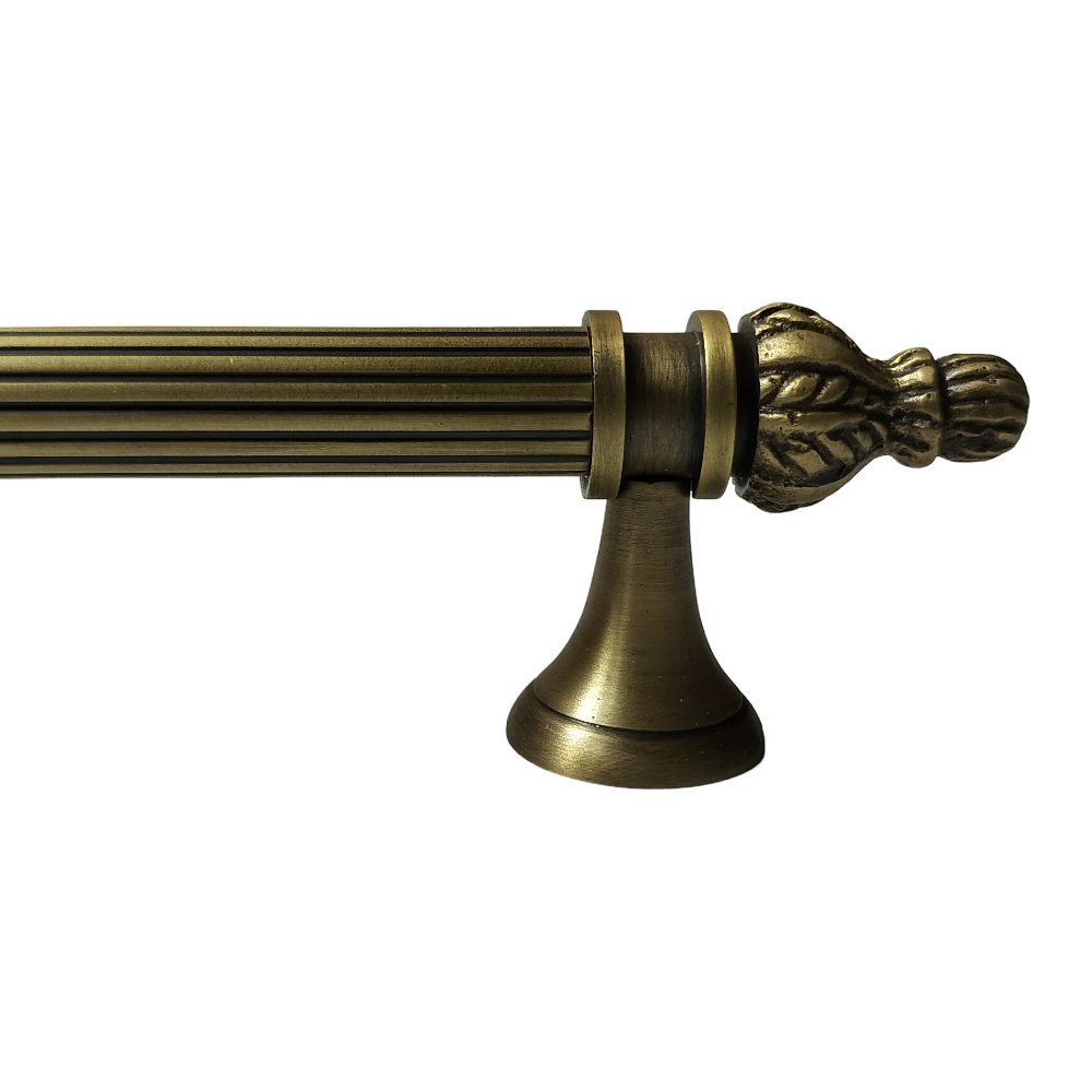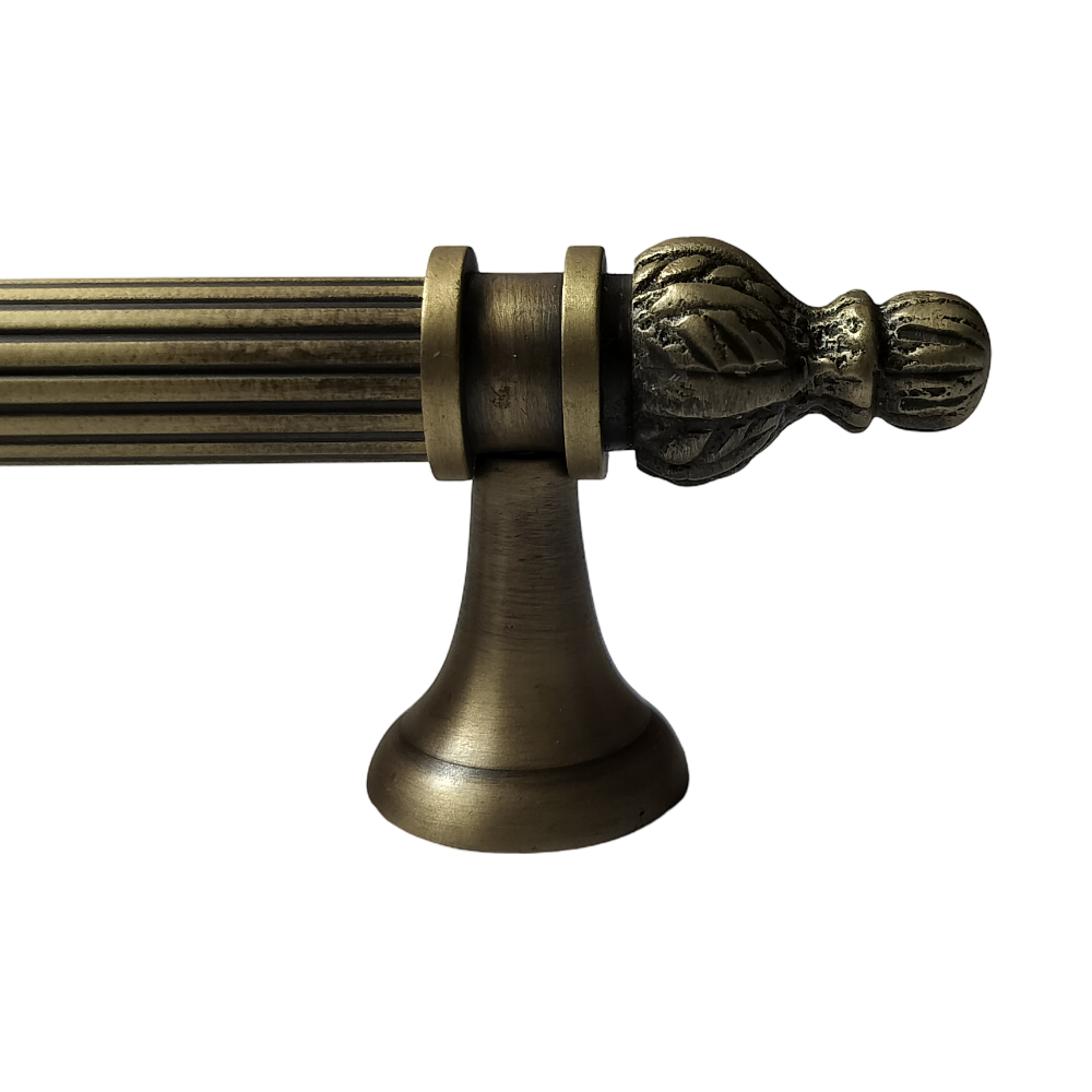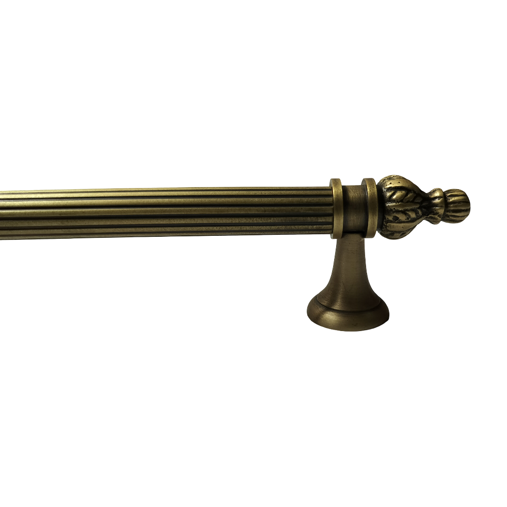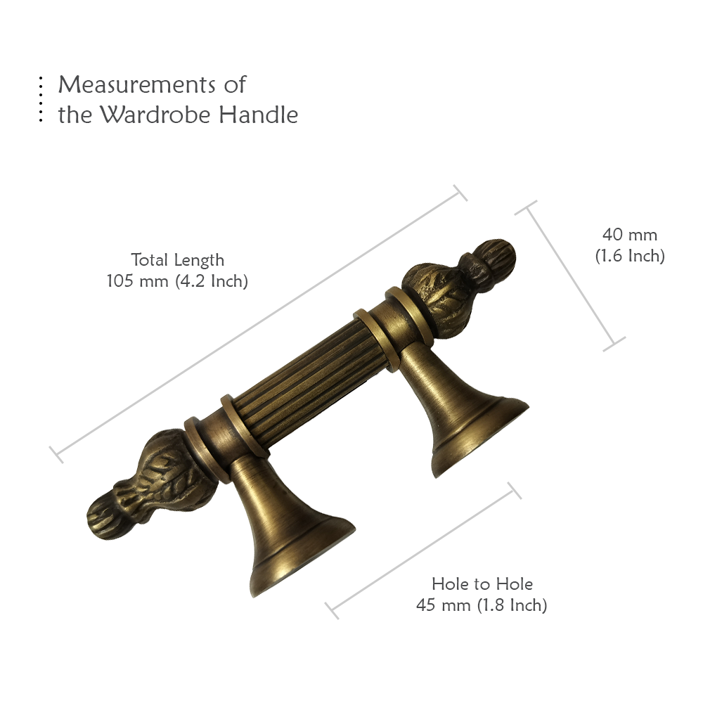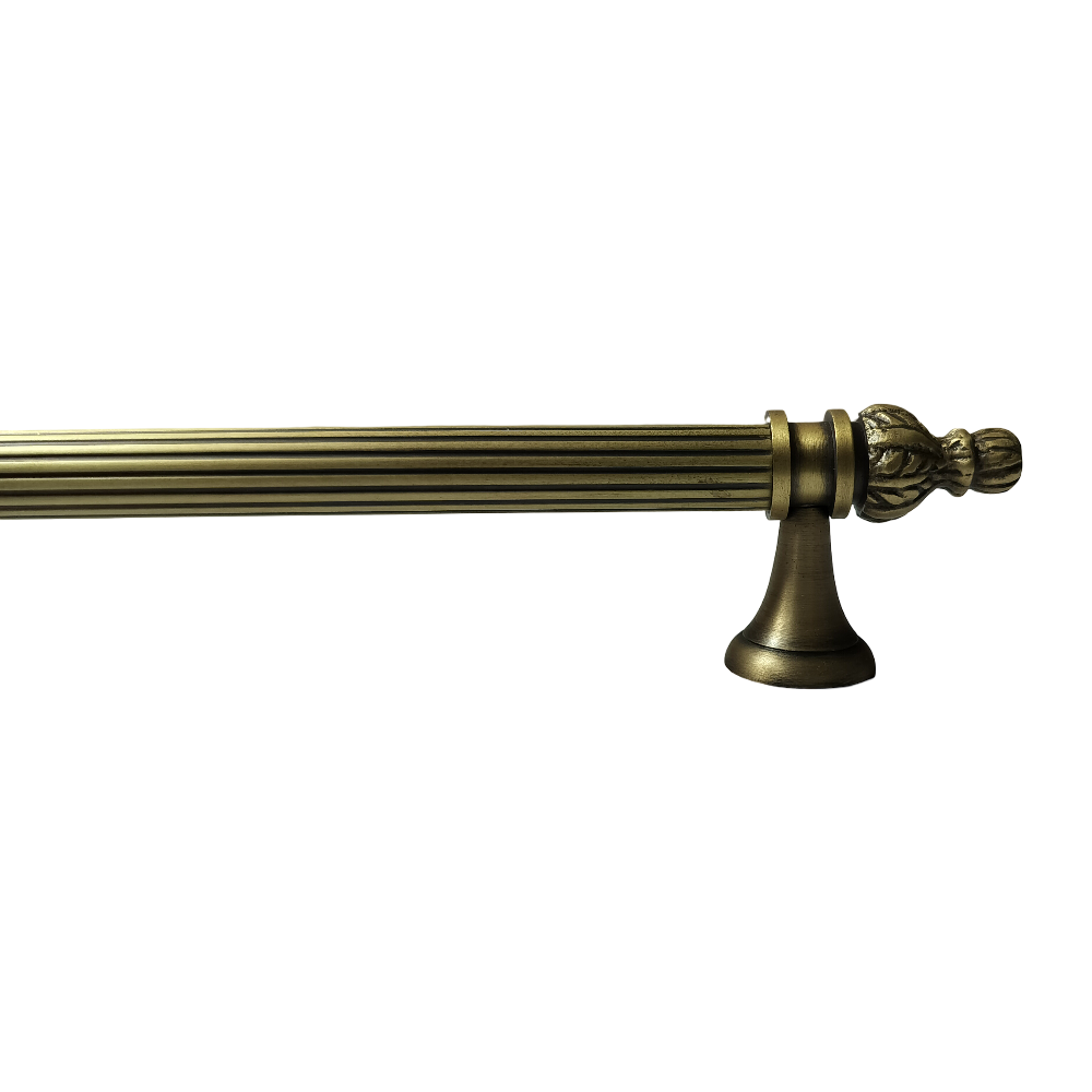 Designed for use on drawers, cabinets, wardrobes, and other wooden furniture, the handle combines classic aesthetics with modern durability. Its fluted central rod offers a secure grip, while the ornamental end caps with floral patterns add a regal touch. The robust brass construction ensures long-lasting performance, and the antique brass finish blends seamlessly with both heritage and contemporary interiors.