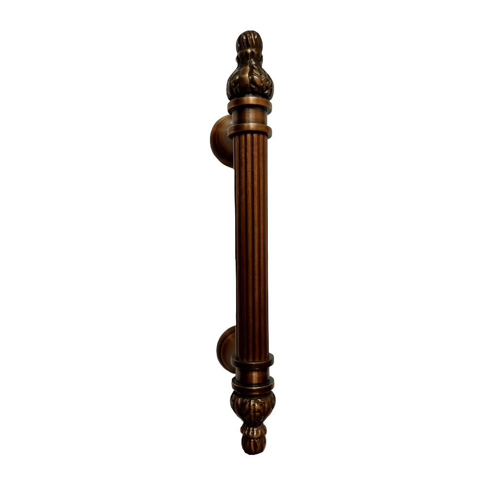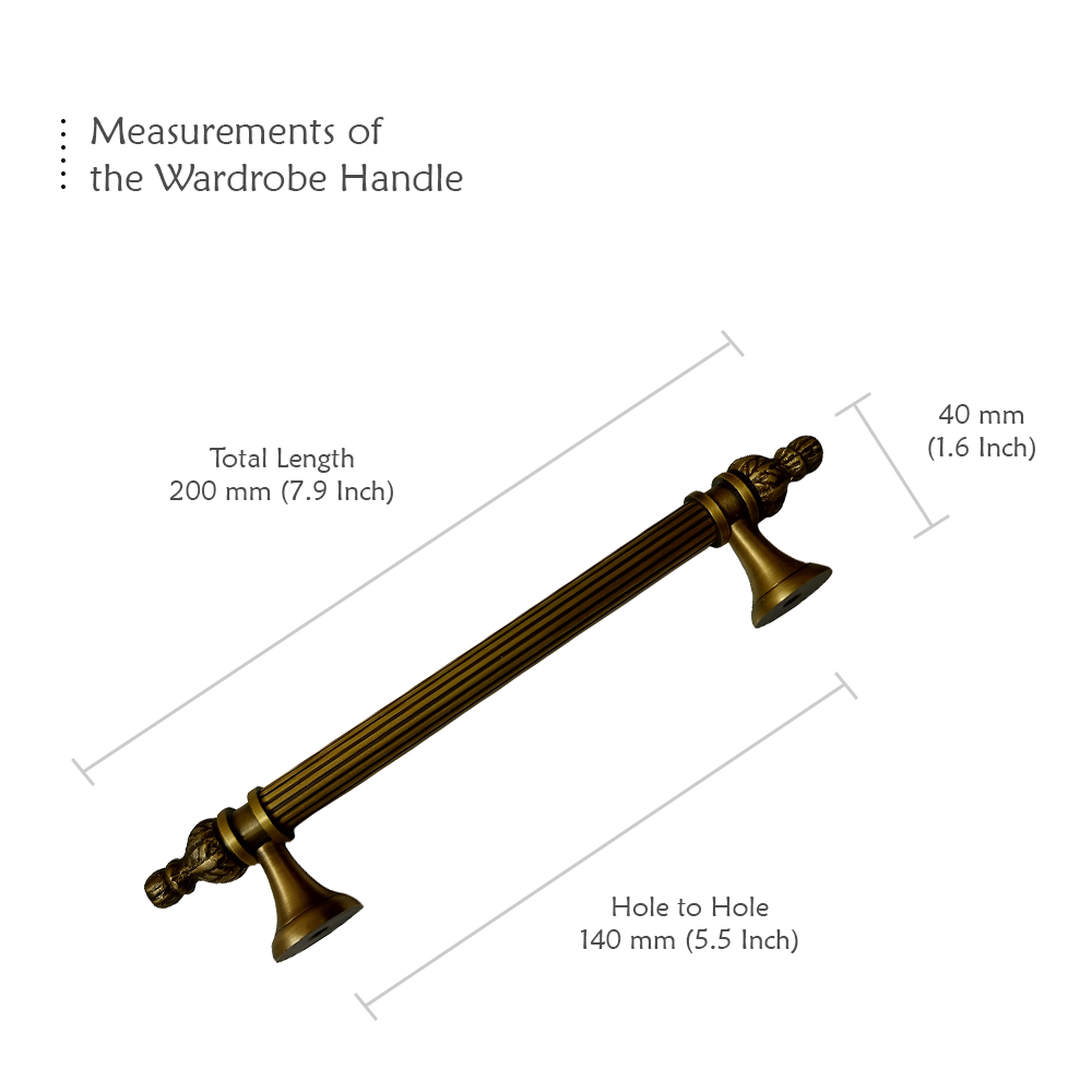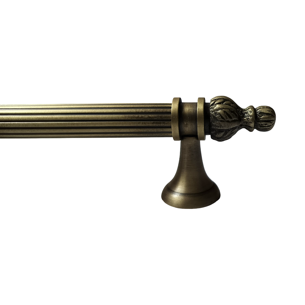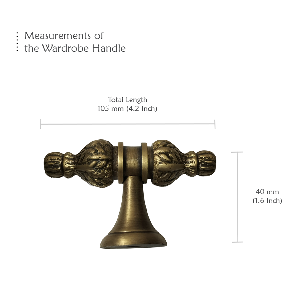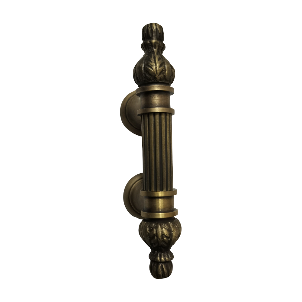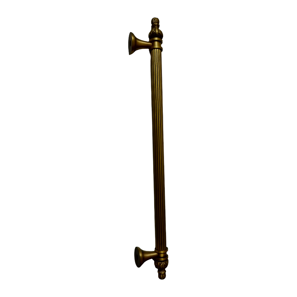 Designed for use on drawers, cabinets, wardrobes, and other wooden furniture, the handle combines classic aesthetics with modern durability. Its fluted central rod offers a secure grip, while the ornamental end caps with floral patterns add a regal touch. The robust brass construction ensures long-lasting performance, and the antique brass finish blends seamlessly with both heritage and contemporary interiors.