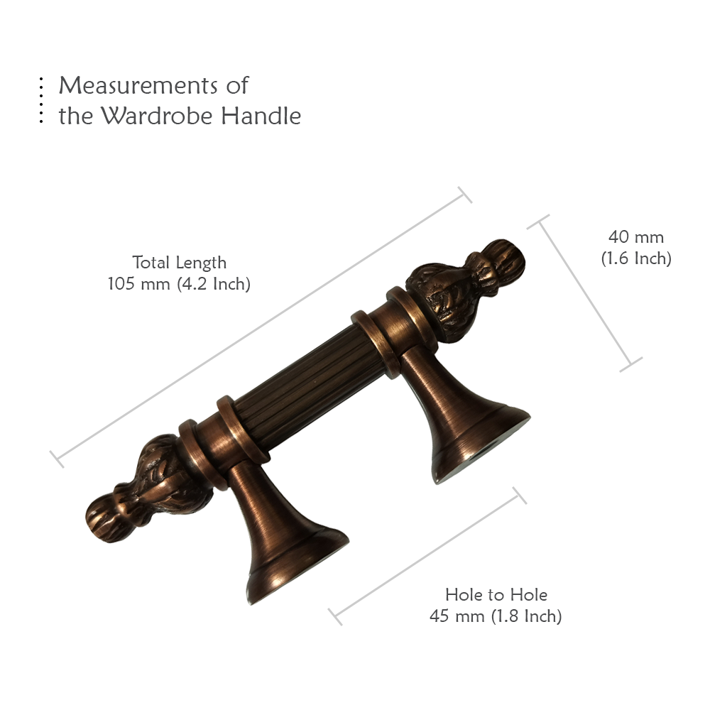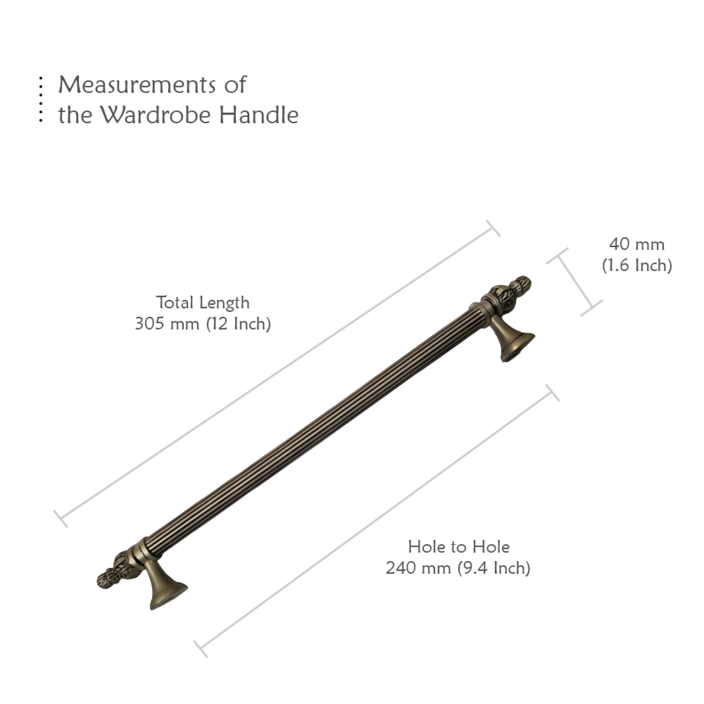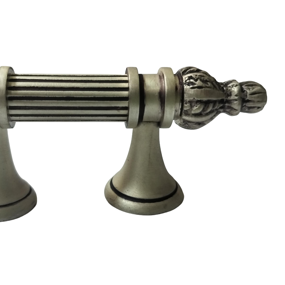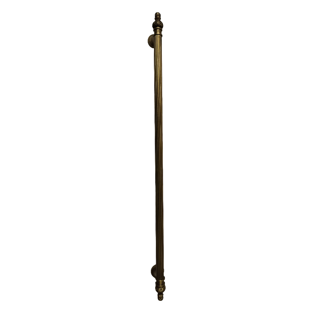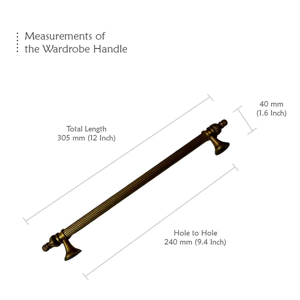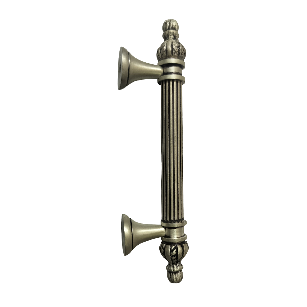 Designed for use on drawers, cabinets, wardrobes, and other wooden furniture, the handle combines classic aesthetics with modern durability. Its fluted central rod offers a secure grip, while the ornamental end caps with floral patterns add a regal touch. The robust brass construction ensures long-lasting performance, and the antique brass finish blends seamlessly with both heritage and contemporary interiors.