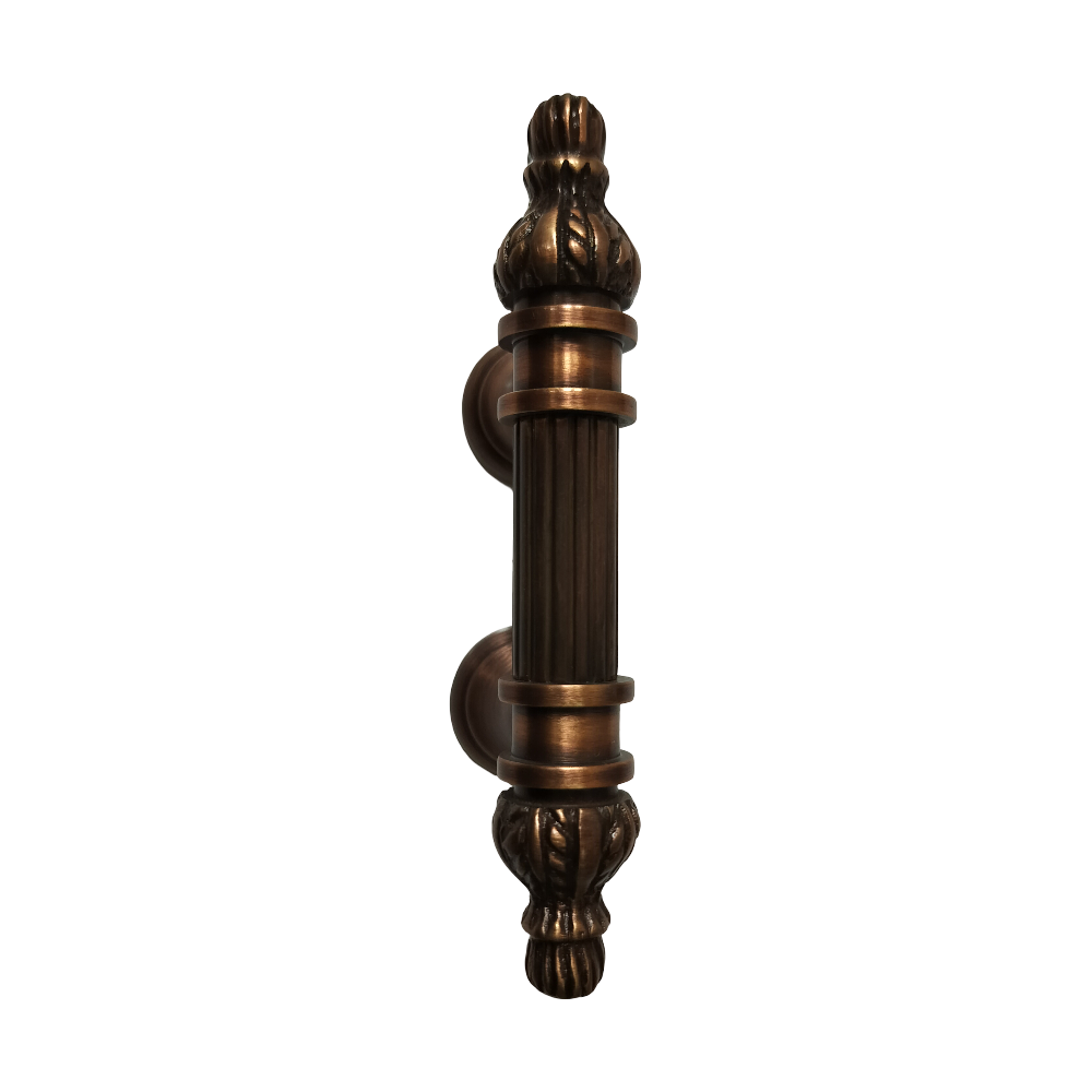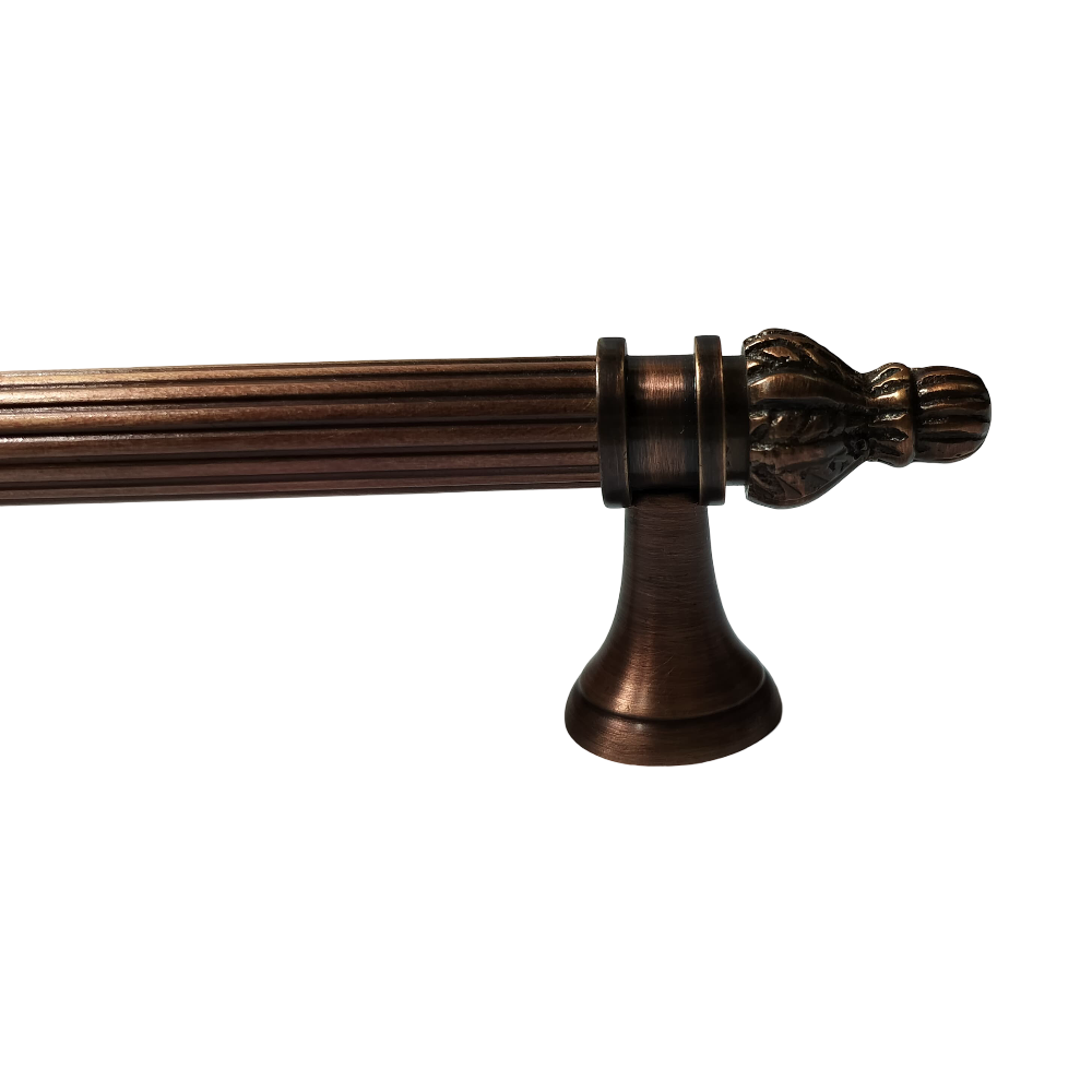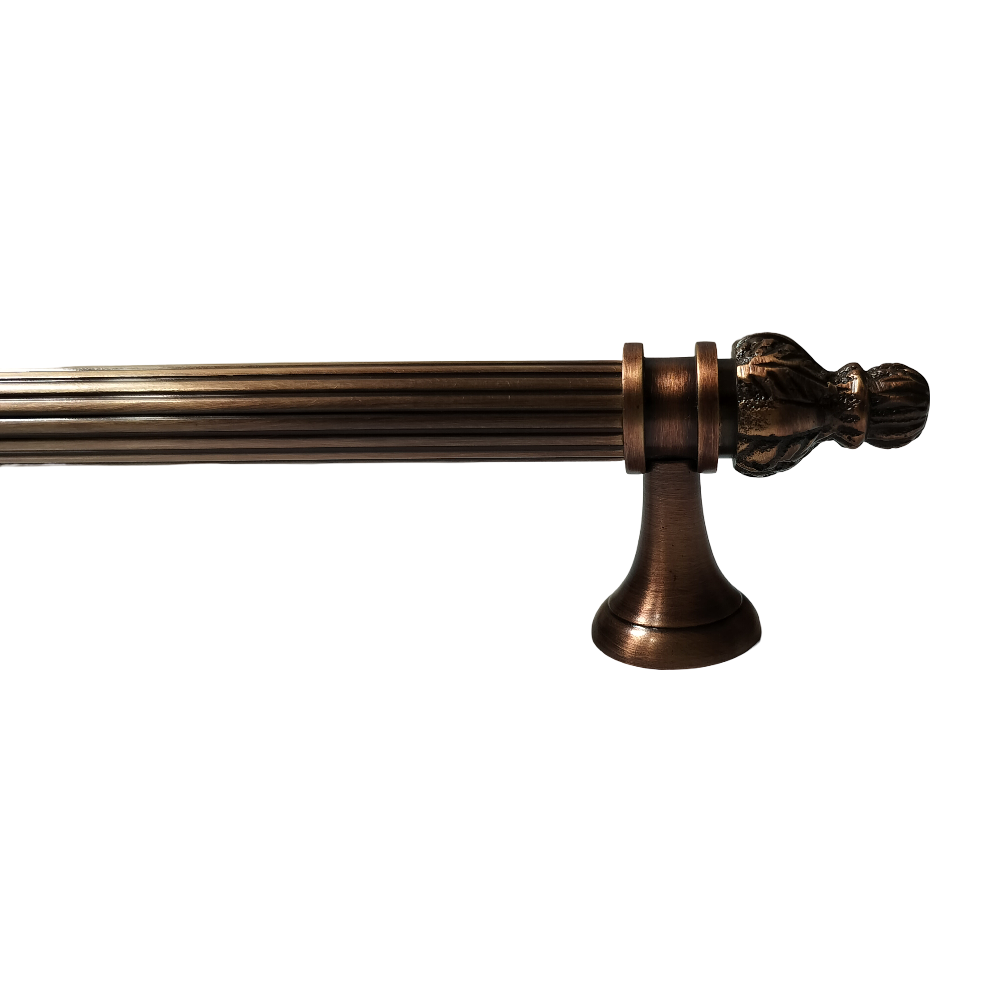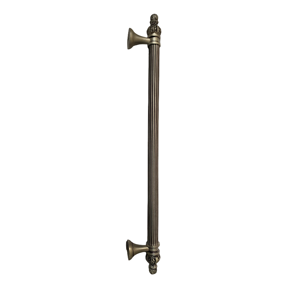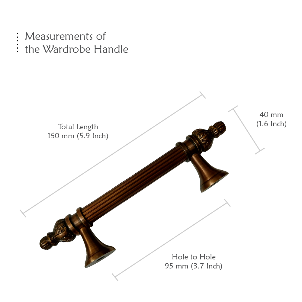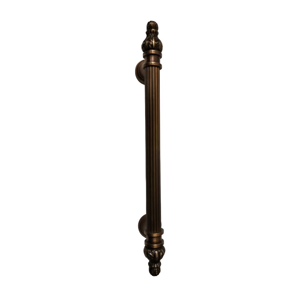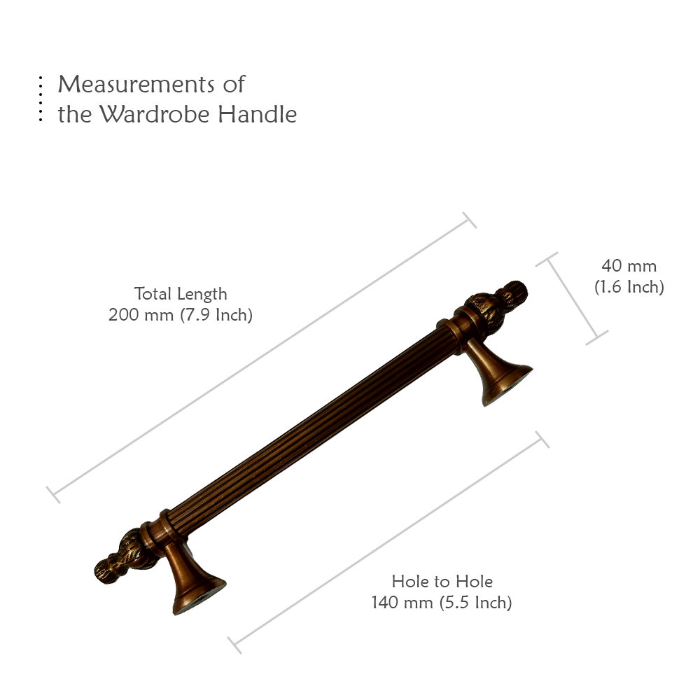 Designed for use on drawers, cabinets, wardrobes, and other wooden furniture, the handle combines classic aesthetics with modern durability. Its fluted central rod offers a secure grip, while the ornamental end caps with floral patterns add a regal touch. The robust brass construction ensures long-lasting performance, and the antique brass finish blends seamlessly with both heritage and contemporary interiors.
